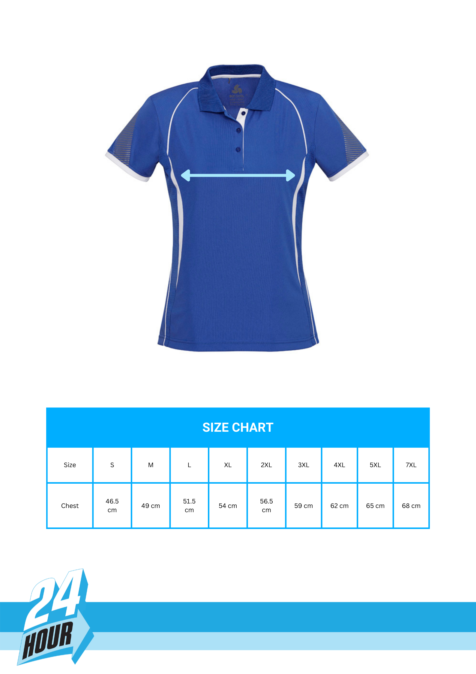 Chest | 46.5 cm | 49 cm | 51.5 cm | 54 cm | 56.5 cm | 59 cm | 62 cm | 65 cm | 68 cm |