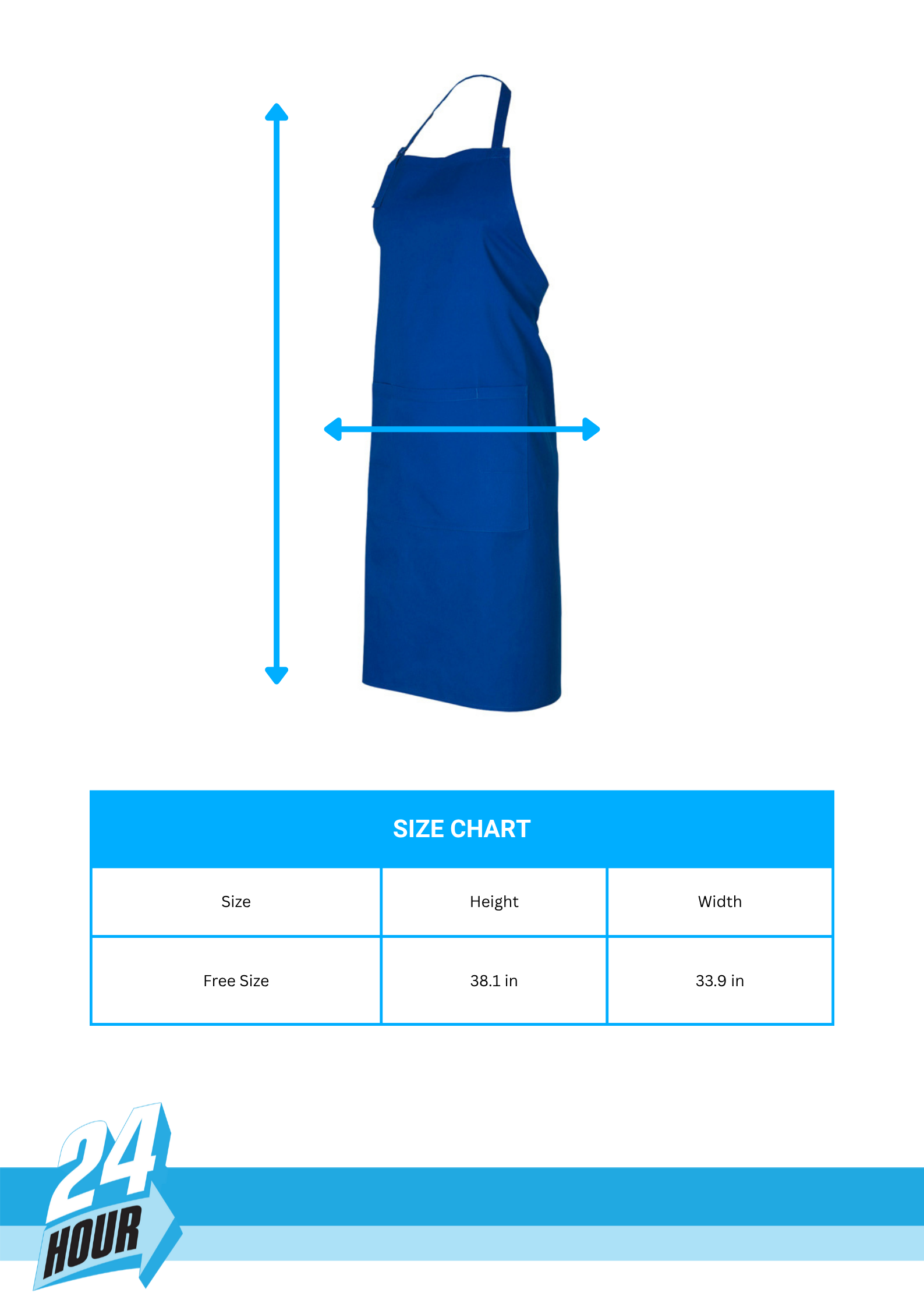 65% Polyester, 35% Cotton Twill 5.6 oz/yd2 Bib apron with adjustable halter self fabric strap around neck Unique styling Towel loop at back of apron Central front pocket with provisions for pen/bottle opener Free size 38.1in x 33.9in