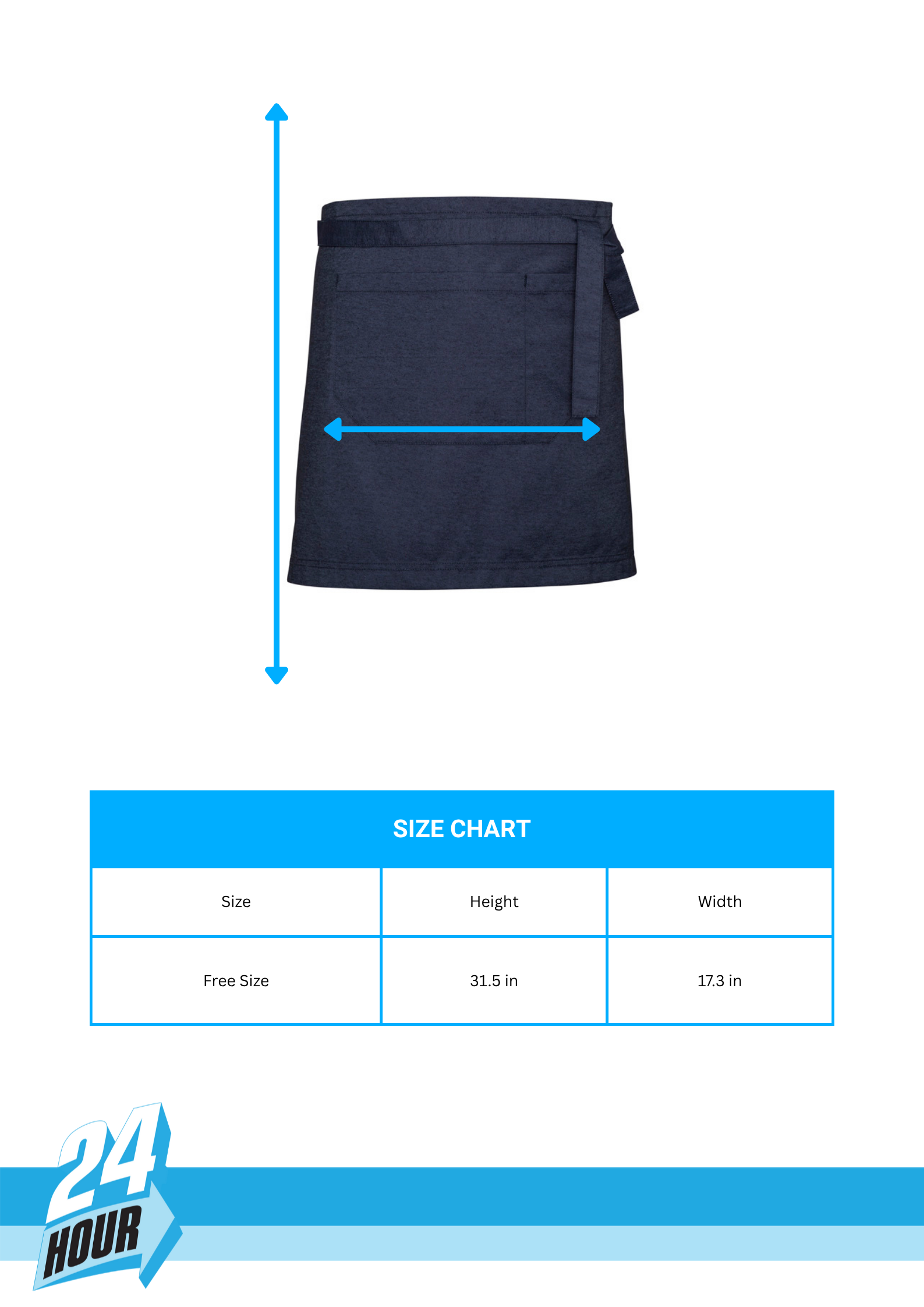 50% Cotton, 50% Polyester textured fabric 5.5 oz/yd2 Comes with removable self-fabric waist straps Divided front pocket Reinforced stitched and antique brass fittings Free size 31.5in x 17.3in