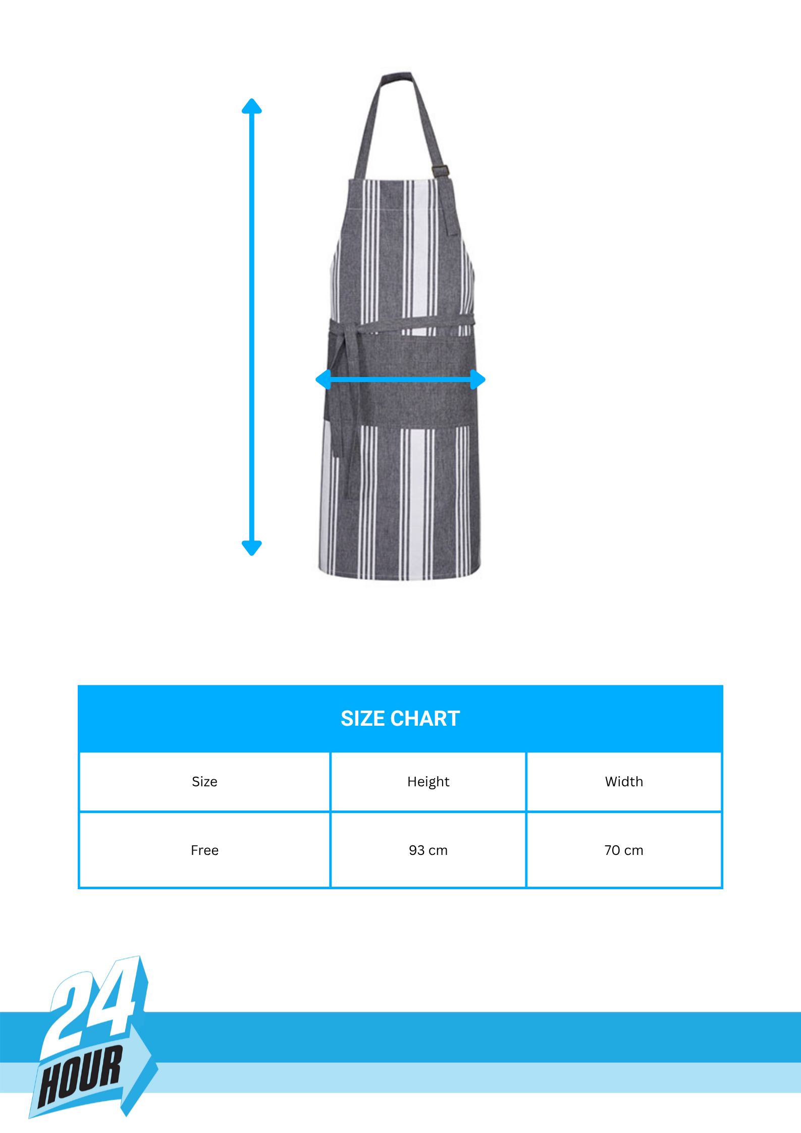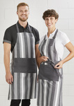 Butcher, Baker or Candle Maker? Our Salt apron is designed to be as distinctive as you with wide 'salt n pepper' chambray statement stripes that are visually memorable and unique. 100% Cotton textured fabric, 240 GSM Unique chambray statement stripe apron Contrast divided front pocket with reinforced stitching Attached straps with adjustable D-ring neck loop Free size 93cm x 70cm